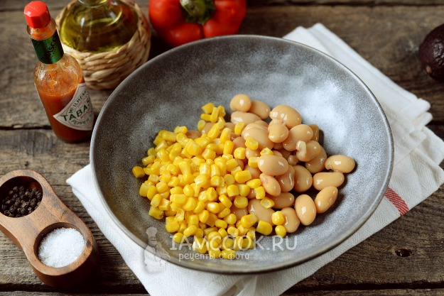 Слейте воду с кукурузы и соус с фасоли, отмерьте нужное количество, переложите в глубокую тарелку.