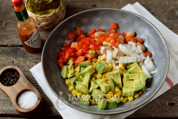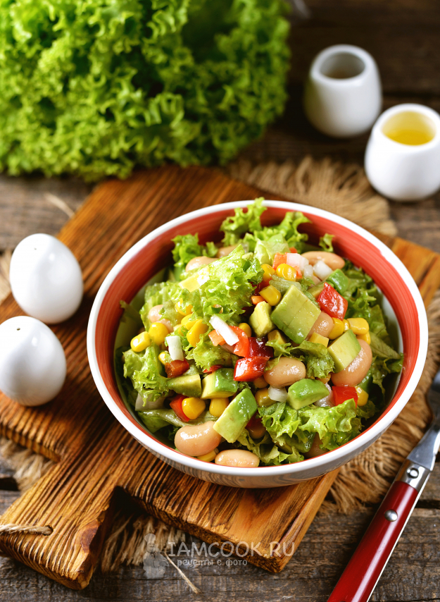 Мексиканский салат с авокадо, консервированной фасолью и кукурузой готов. Подавайте сразу же после приготовления.