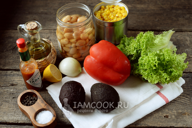 Подготовьте необходимые продукты для мексиканского салата с авокадо, фасолью и кукурузой. Латук и перец помойте, обсушите.