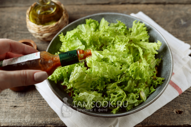 Последним положите измельченный салат латук. Заправьте оливковым маслом, лимонным соком, солью и перцем по вкусу, а также влейте острый соус или же добавьте измельченный перчик чили. Аккуратно перемешайте все ингредиенты в тарелке и сразу же подавайте к столу.