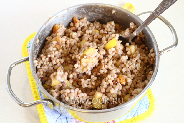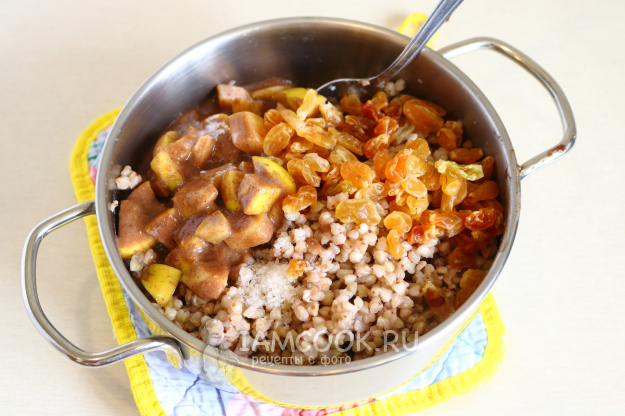 Кашу посолим, добавим изюм и яблоки в соусе.