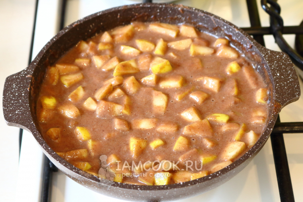 Добавим около полстакана (100 мл) горячей воды, перемешаем и потушим минут 5 - до мягкости яблок.