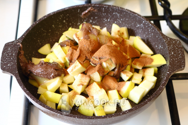 Выложим на сковороду кусочки яблок, мёд и ореховую пасту, всыплем корицу.