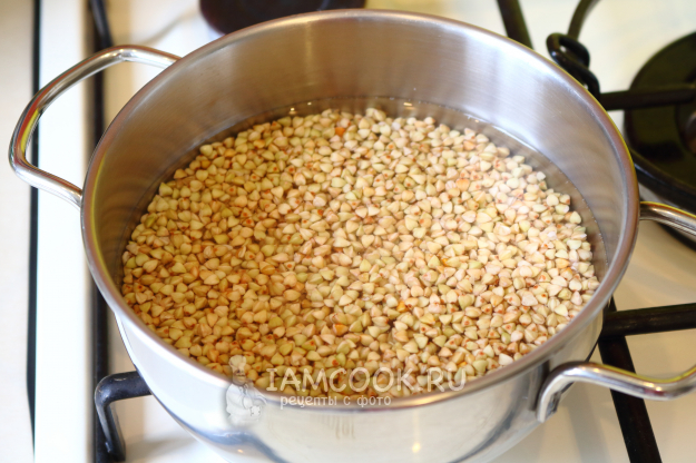 В кастрюлю нальём стакан (250 мл) холодной воды и выложим гречку.