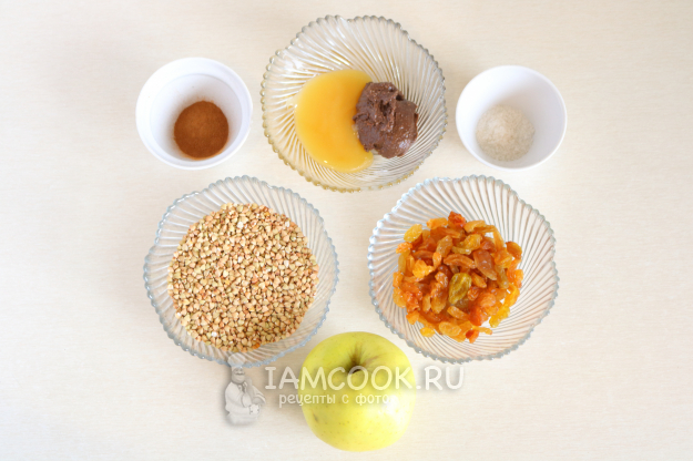 Для приготовления сладкой каши из зелёной гречки возьмём следующие ингредиенты.
