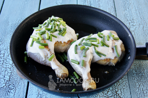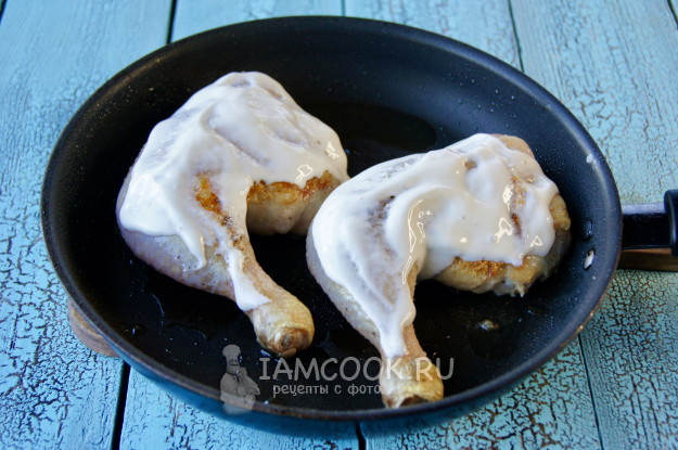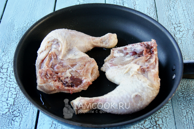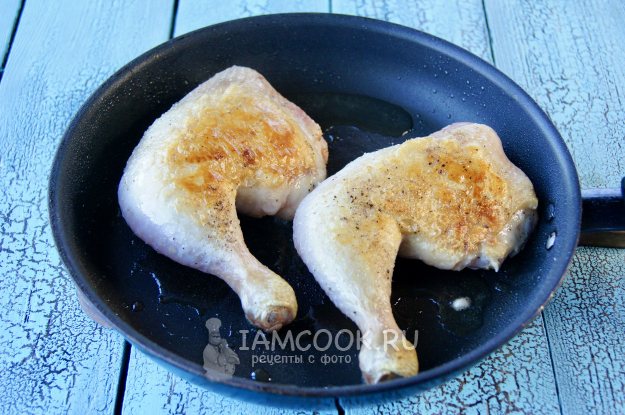 Куриные окорочка промойте, срежьте лишний жир, по желанию снимите кожу, если хотите, чтобы блюдо было не очень жирным. Натрите солью и перцем со всех сторон, выложите кожей вниз на разогретую сковороду с растительным маслом и обжарьте до румяности на огне выше среднего.