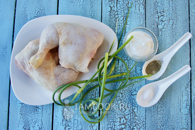 Возьмите все необходимые продукты для приготовления тушеных куриных окорочков на сковороде.