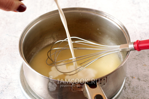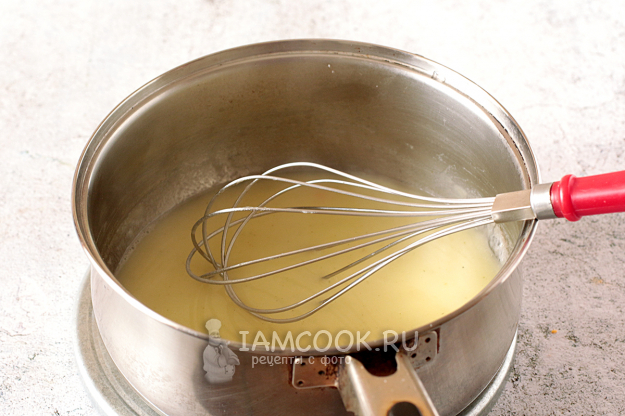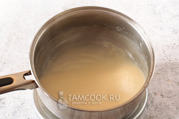 В ковшике растопите сливочное масло и добавьте муку. Тщательно и быстро размешайте венчиком муку вместе с маслом.