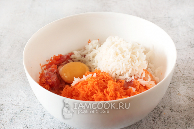 Добавьте остывший рис к фаршу с морковью, вбейте яйцо. Если получится жидковато, то подсыпьте панировочные сухари. Посолите по вкусу и добавьте специи.