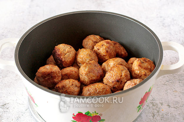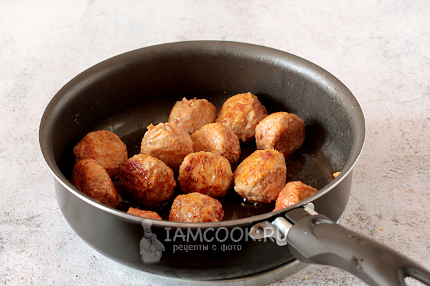 Обжарьте тефтели в несколько приемов в небольшом количестве масла до румяной корочки, чтобы все соки внутри сохранились.