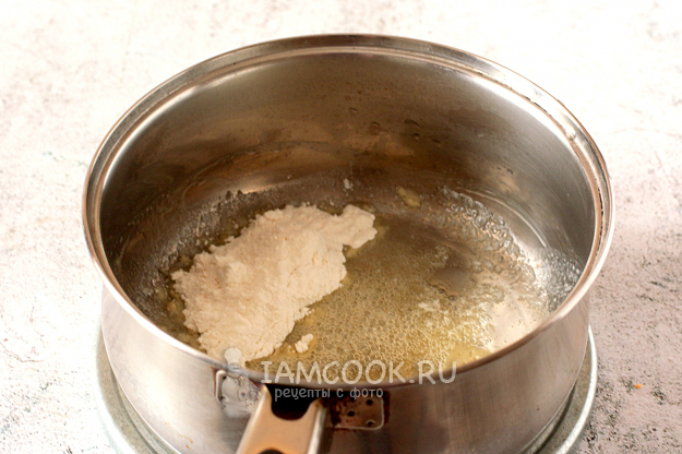 При постоянном помешивании поджарьте муку вместе с маслом пару минут.