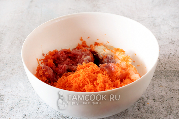 В удобной емкости смешайте фарш, тертую на средней терке морковь и лук. Раздавите зубчик чеснока.