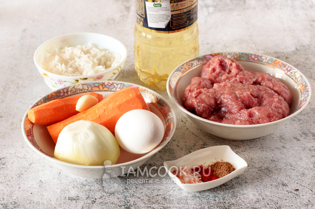 Подготовьте необходимые продукты для мясных тефтелей с морковью и рисом.