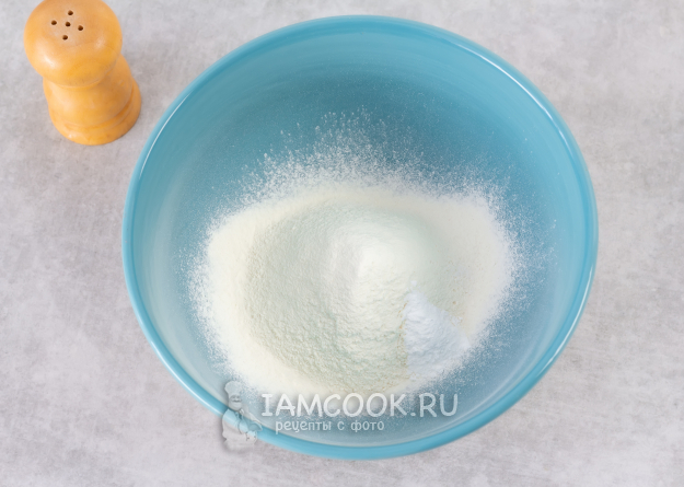 Просейте в миску пшеничную муку. Добавьте небольшую щепотку соли и разрыхлитель.