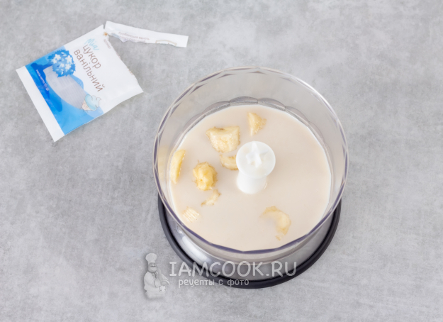 Слегка охладите банан, очистите, разломайте на кусочки и поместите в чашу блендера. Добавьте овсяное молоко и, по желанию, немного ванильного сахара (ванилина или ванильного экстракта) или щепотку ваших любимых специй для десертов.