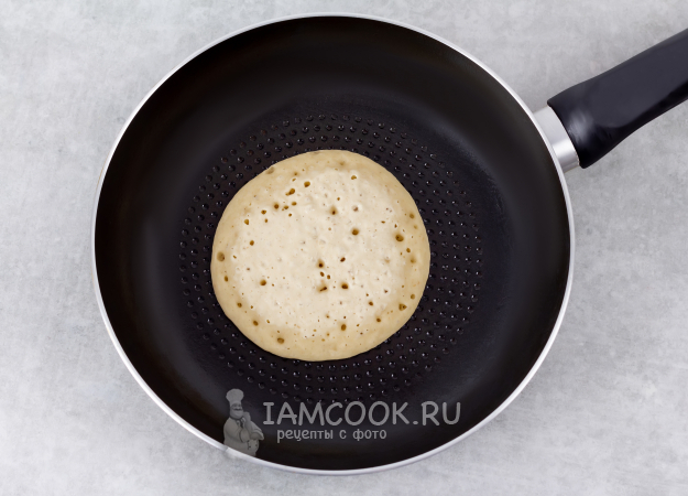 Разогрейте сковороду на среднем огне и кисточкой смажьте тонким слоем растительного масла. Выложите в разогретую сковороду 2-3 ст.л. теста и обжарьте примерно 2 минуты, пока поверхность теста не станет матовой.