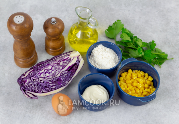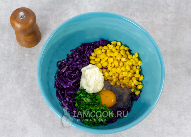 К подготовленной капусте добавьте 1 куриное яйцо, майонез, консервированную кукурузу (без жидкости), немного молотого черного перца и, по желанию, измельченную зелень. Хорошо все перемешайте.