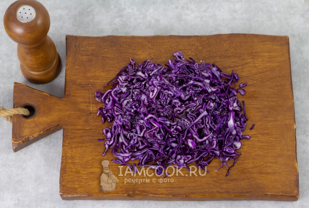 Вымойте, обсушите капусту. Удалите поврежденные, грубые верхние листья. Тонко нашинкуй капусту, присыпьте 1-2 небольшими щепотками соли и помните руками, пока капуста не пустит сок и не станет мягкой. Молодой капусте достаточно минимальной подготовки. В случае со зрелой капустой постарайтесь нашинковать капусту максимально тонкой и короткой соломкой, и чуть более тщательно разомните.