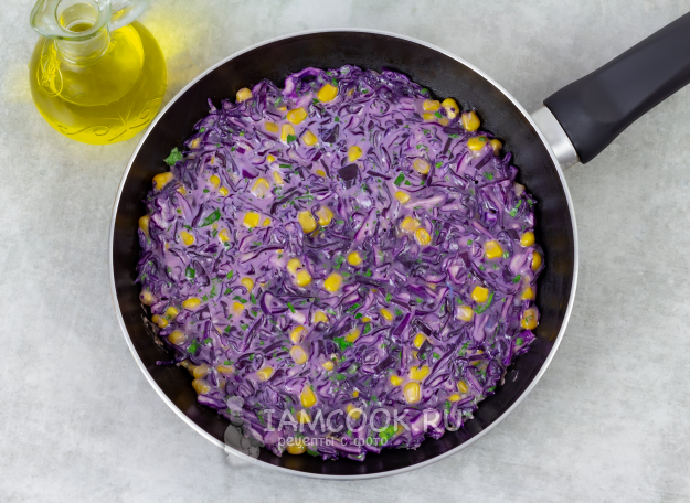 Разогрейте сковороду на среднем огне. Смажьте дно сковороды растительным маслом, выложите подготовленную смесь и разровняйте. Обжарьте получившуюся лепешку 6 минут.