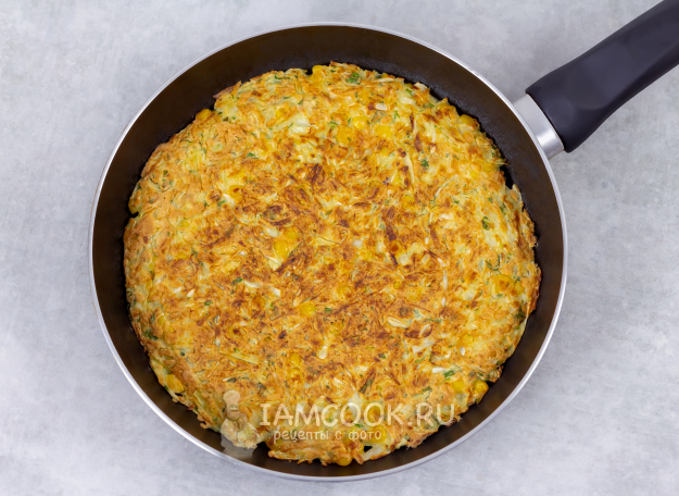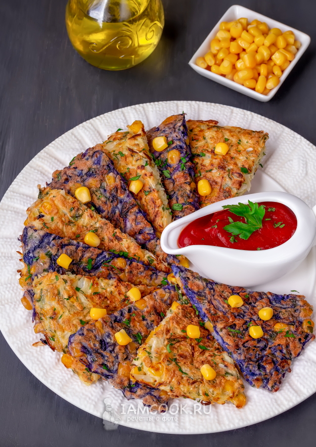 Готовую капустную лепешку переложите на тарелку и нарежьте на 4-8 частей. Подавайте блюдо самостоятельно, в горячем или теплом виде, дополнив соусом по вкусу. По желанию, украсьте блюдо щепоткой мелко нарезанной зелени или зерен консервированной кукурузы.