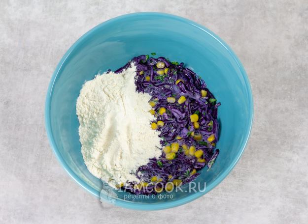 Добавьте пшеничную муку. Еще раз все хорошо перемешайте. Смесь получится густой и вязкой.