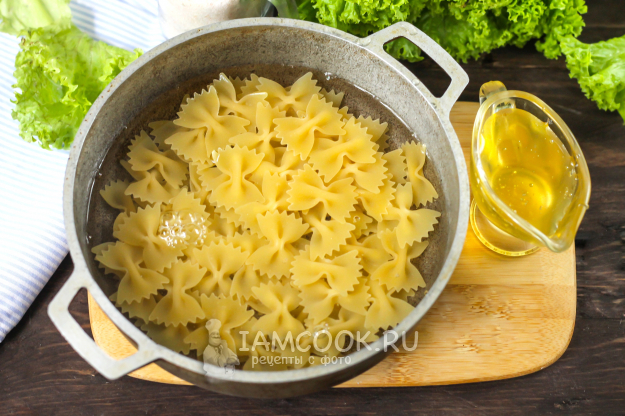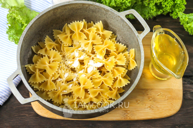 Макароны высыпьте в казан и добавьте туда же соль. Мне удобнее заливать пасту кипятком и сразу же варить. Вы же можете сначала вскипятить воду, затем всыпать в нее макароны и соль.