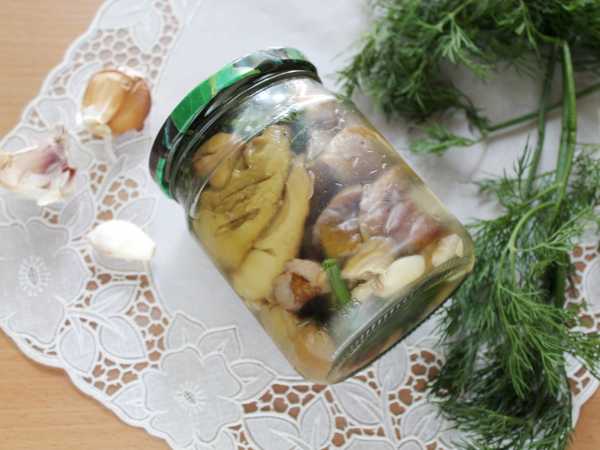 Прикройте грибы укропом и выложите остальной чеснок. Накройте кастрюлю подходящим блюдцем или тарелкой и поставьте груз. Выделившийся сок покроет грибы и постепенно превратится в рассол. Оставьте на сутки в комнатных условиях, а потом поставьте в холодильник, убрав груз и накрыв обычной крышкой.
