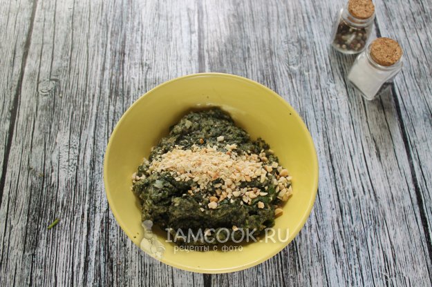 Добавьте орехи в фарш и хорошо перемешайте его.