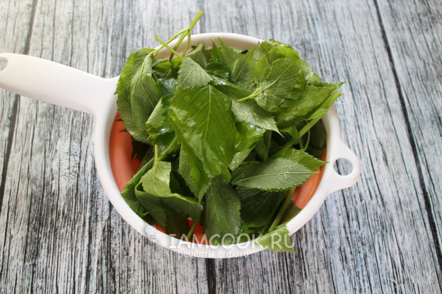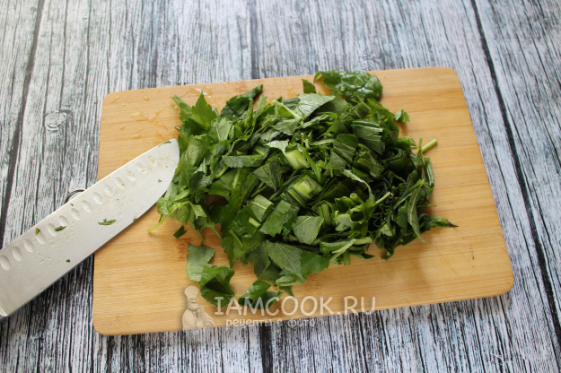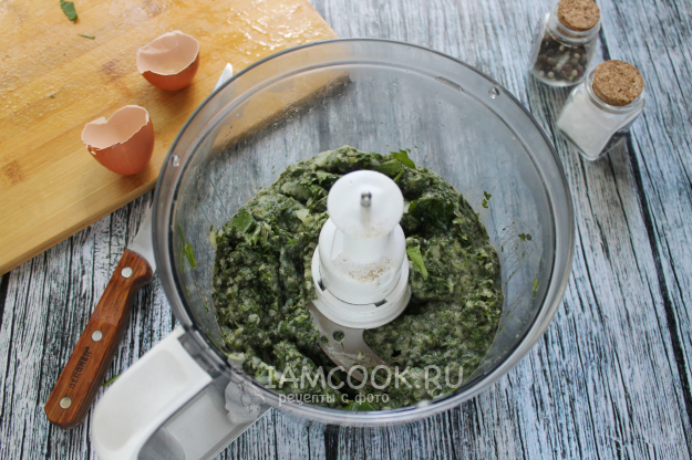 Листья сныти хорошо промойте и обдайте горячей водой - иногда в листочках любят прятаться насекомые и слизни (редко). Откиньте на сито и дайте хорошо стечь воде, промокните бумажным полотенцем. Листья должны быть сухими, чтобы фарш не получился жидким.