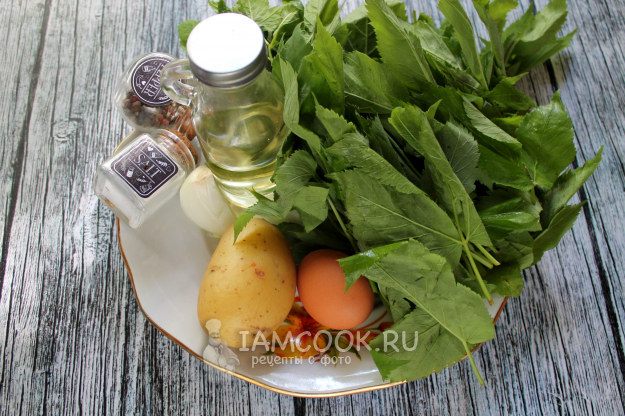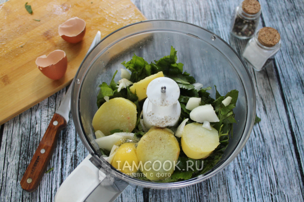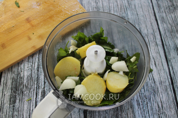 Сложите измельченную сныть в чашу измельчителя или мясорубки, добавьте очищенные и нарезанные крупно картофель и лук. По желанию можно добавить зубчик чеснока.