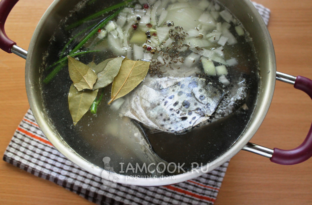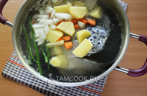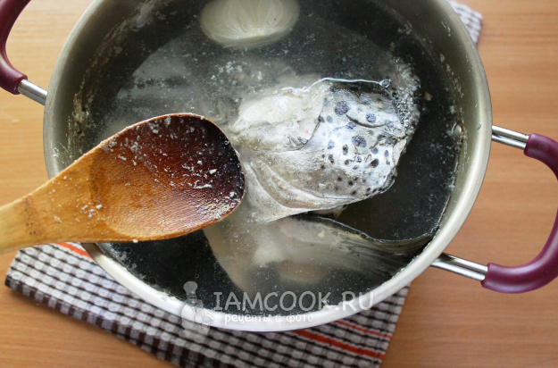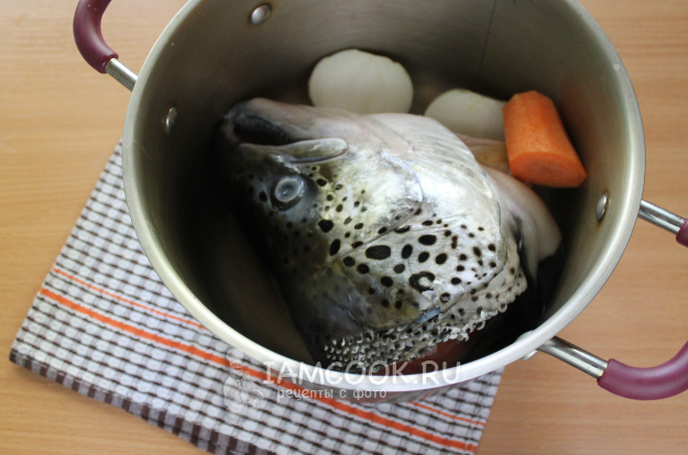 Возьмите подходящую по размеру кастрюлю, положите в нее голову, добавьте часть нормы крупно нарезанного лука и моркови, залейте водой и поставьте на плиту.