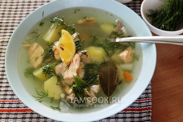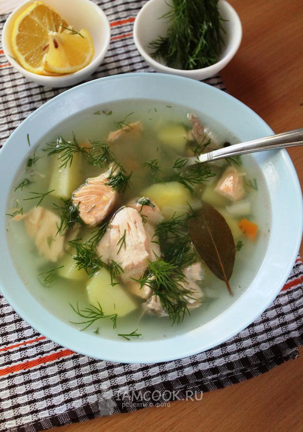 Уха из головы форели готова. Подавайте ее в горячем виде с зеленью укропа и ломтиком лимона.