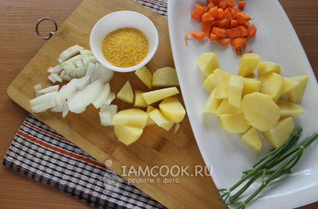 Подготовьте овощи: очистите и крупно порежьте картофель, помельче - лук и морковь. Промойте кукурузную крупу.