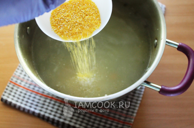 Всыпьте в суп кукурузную крупу. Она варится очень быстро, поэтому просто оставьте уху на медленном огне томиться, пока займетесь разделкой рыбы.