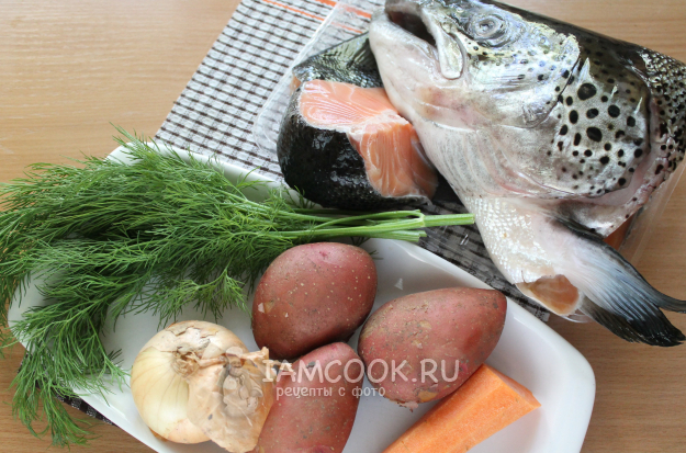 Будем готовить уху из головы форели (в стандартном суповом наборе у меня был еще хвостик и хороший обрезок с мякотью). Возьмите ингредиенты в соответствии с предложенным списком.