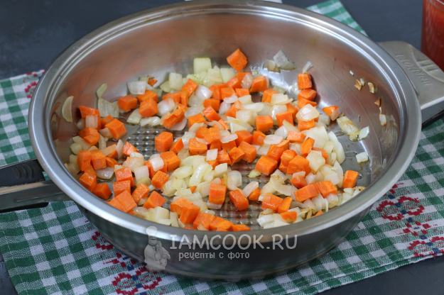 В сковороде разогреть растительное масло, выложить лук с морковью и обжарить до мягкости.