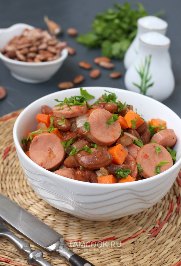 Подготовить из списка ингредиенты для приготовления фасоли с сосисками в томатном соусе.