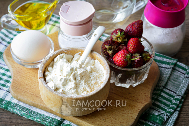 Возьмите все ингредиенты для приготовления вареников из заварного теста с клубникой (на кипятке).