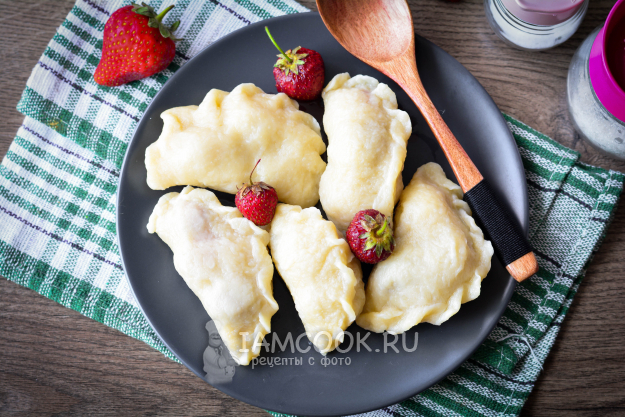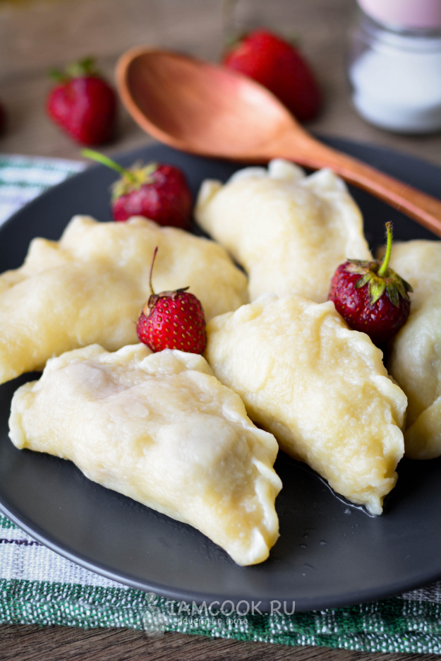 Готовые вареники достаньте шумовкой из воды или просто слейте всю воду из кастрюли, затем выложите вареники каждому в тарелку, подождите пару минут, чтобы они чуть остыли. Вареники из заварного теста с клубникой (на кипятке) готовы - подавайте на стол.
