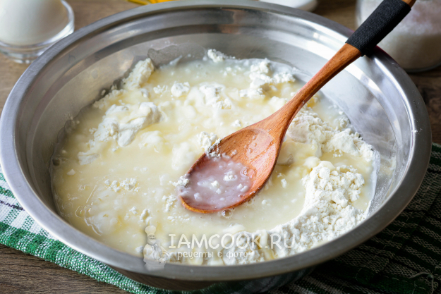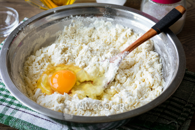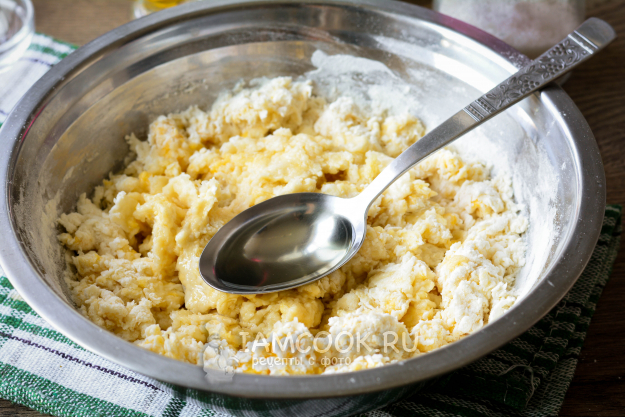 Тесто пока получилось комковатым - так и должно быть. Когда тесто чуть остыло, вбейте куриное яйцо и хорошенько перемешайте.
