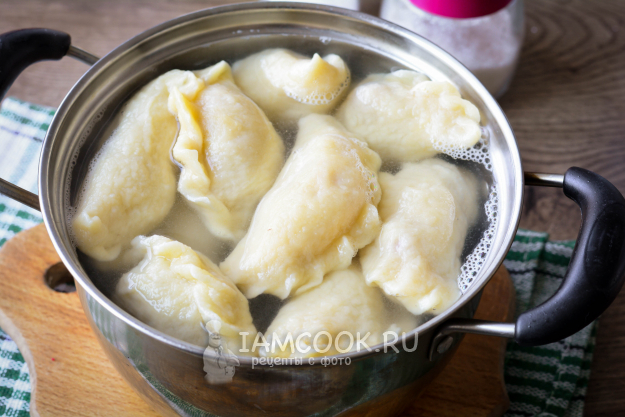 Вскипятите 1,5-2 л воды, слегка подсолите, выложите вареники и сразу размешайте ложкой или лопаткой, чтобы не прилипли ко дну и не слиплись друг с дружкой. Варите вареники 4-5 минут после повторного закипания воды. Когда вареники полностью сварятся, они обычно всплывают на поверхность воды.