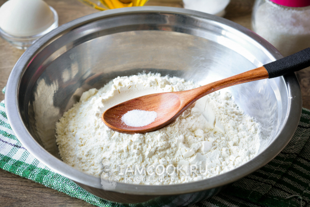 Просейте в миску пшеничную муку, добавьте 1-2 щепотки соли, чтобы тесто получилось более насыщенным по вкусу и не пресным. Соль придает тесту сбалансированный вкус. Перемешайте муку с солью.