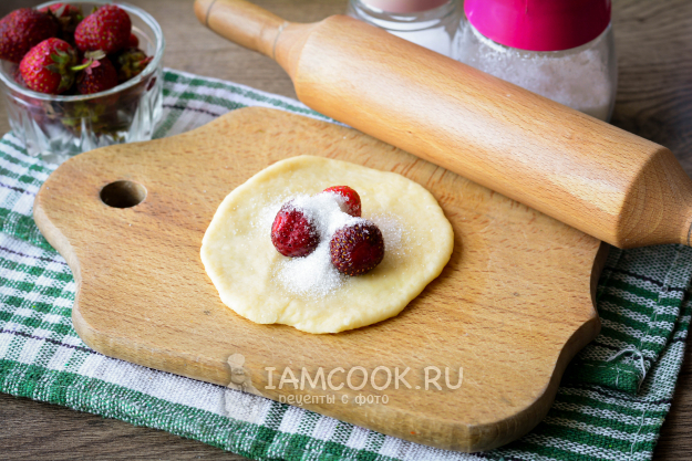 Выложите начинку на тесто для вареника - 2-3 ягодки вымытой клубнички без хвостиков и сахар по вкусу. Обычно я кладу по 1 ч.л. (без горки) сахара в каждый вареник. Также советую для рецепта использовать некрупную клубнику. Ее будет достаточно вымыть, оторвать хвостики. Если все-таки у вас крупная клубника, то разрежьте ее на 2-3 части - слепить вареники будет намного проще и они не разорвутся.