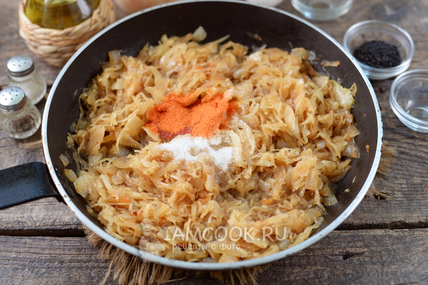 Когда капуста будет достаточно мягкой, всыпьте любимую приправу, перец молотый и сахар по вкусу. Перемешайте, подержите на умеренном огне до полного испарения жидкости. Жидкость действительно должна выпариться полностью, иначе готовый пирог будет мокрым, а слоеное тесто - невкусным и тяжелым. Соль я не кладу, но смотрите по своему вкусу. Начинку остудите.