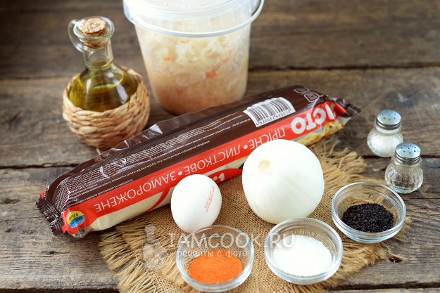Подготовьте необходимые продукты для пирога с квашеной капустой (из слоеного теста). Лук очистите от шелухи, помойте, обсушите. Тесто предварительно разморозьте прямо в упаковке при комнатной температуре.