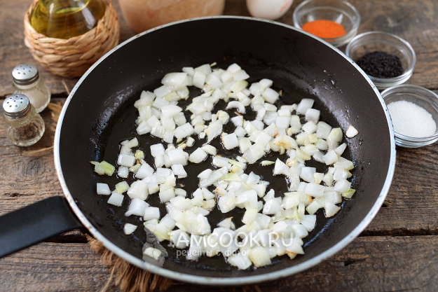 Разогрейте в сковороде постное масло, обжарьте на нем нарезанный мелким кубиком лук до прозрачности и сладости.
