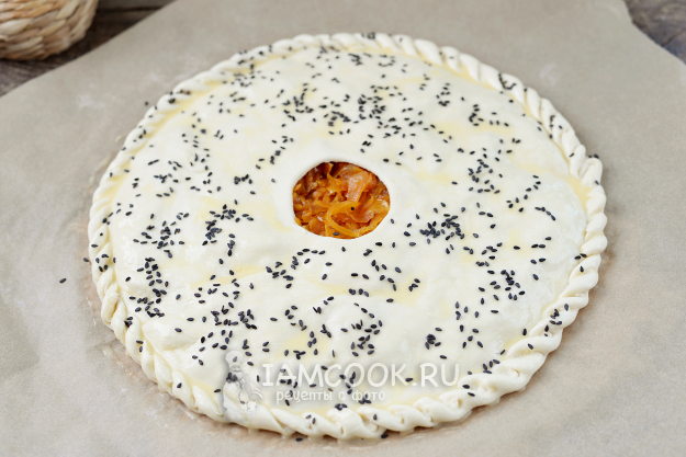 Смажьте поверхность пирога взбитым яйцом и посыпьте кунжутом. Отправьте заготовку в предварительно разогретую до 180 градусов духовку на 25 минут в режиме верхнего и нижнего нагрева.