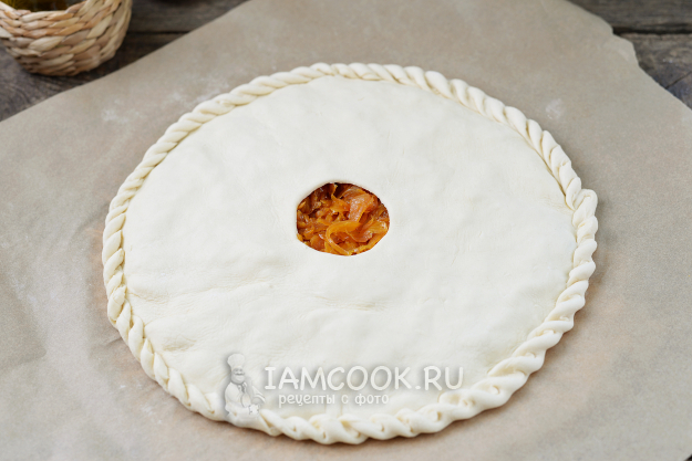 Накройте сверху второй такой же заготовкой, с дырочкой в центре, проделанной рюмкой с маленьким горлышком - таким образом ваш пирог не вздуется во время запекания и не деформируется. Заверните края пирога, чтобы лучше держался и выглядел в готовом виде симпатично.