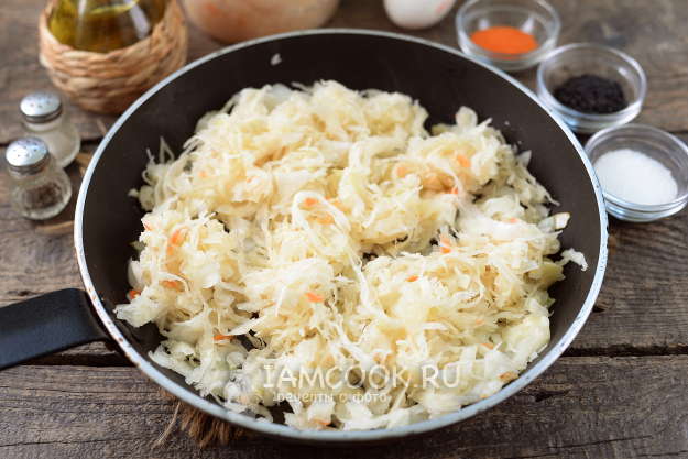 Добавьте квашеную капусту, накройте крышкой. Тушите на умеренном огне минут 25-30. Время от времени подливайте воду, чтобы капуста не пригорала к сковороде.