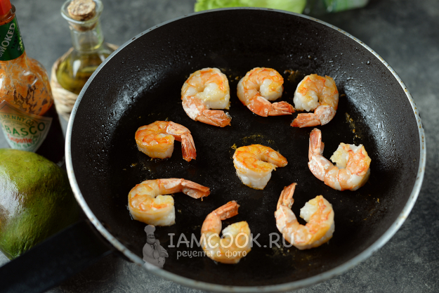В минимальном количестве постного масла обжарьте креветок минуты по 1,5 с каждой стороны.